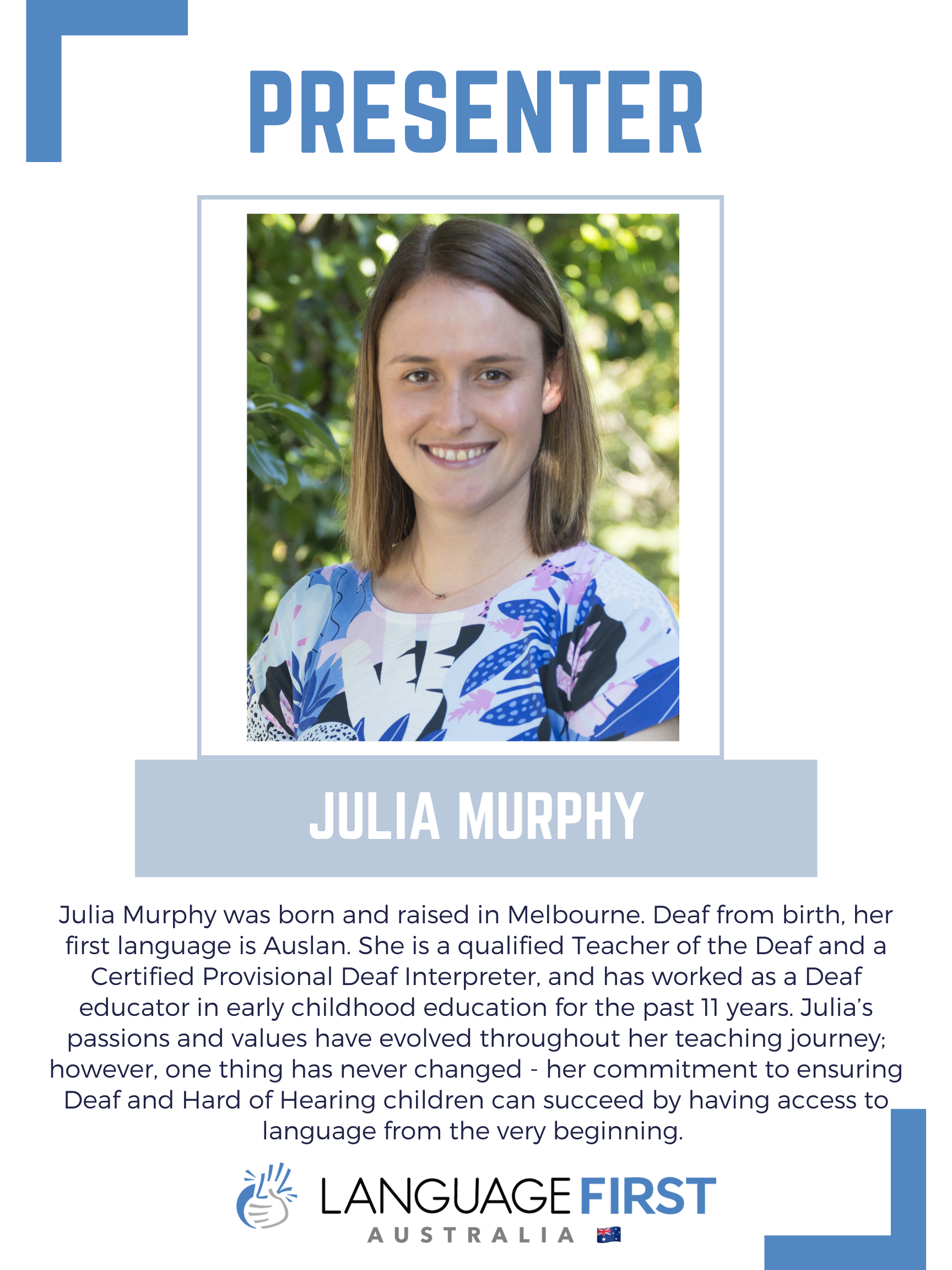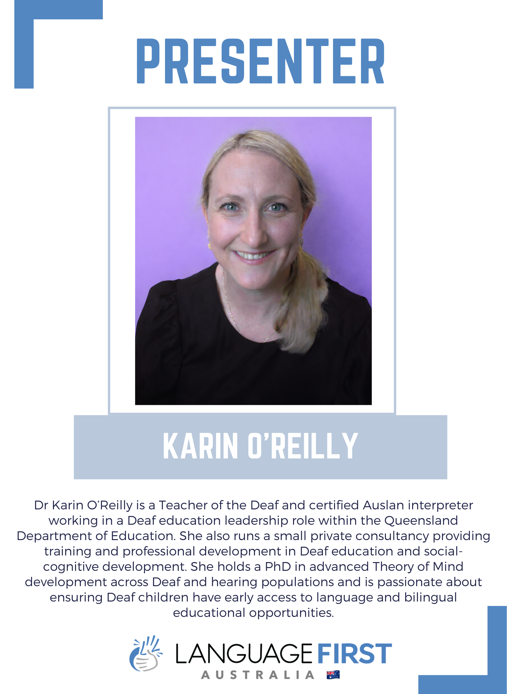Financial disclosures: Dr O’Reilly is receiving an honorarium from Language First for presenting. She is also employed in a leadership role within the Queensland Department of Education and operates a sole consultancy providing assessment and advisory services in Deaf education and social-cognitive development.