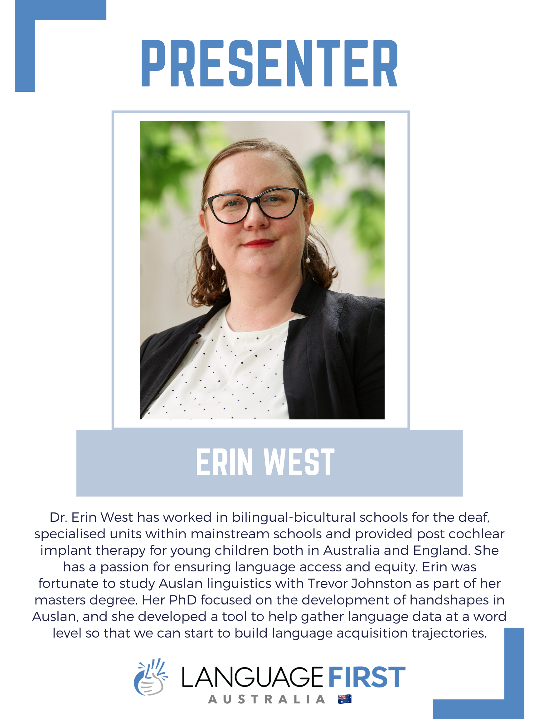 Financial disclosures: Dr West is receiving payment from Language First for presenting. She also works for Speech Pathology Australia, but this is unrelated to her research.