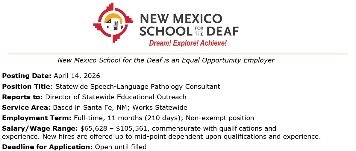 Job Description: The Statewide Speech-Language Pathology Consultant partners with school districts across New Mexico to support deaf and hard of hearing (D/HH) students who use spoken language, signed language, or both, as well as the educational teams that serve them. This position provides educational and language consultation, coaching, and training to SLPs, LEA administrators, classroom teachers, families, and other team members. Responsibilities also include projects that promote high-quality language programming for D/HH students statewide. All work is student-centered, collaborative, and aligned with the mission and vision of the New Mexico School for the Deaf.
