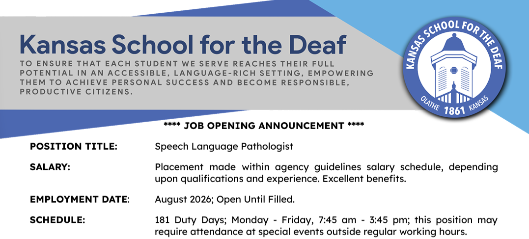 Click here for the full job opening announcement. To request an application, please email hr@kansasdeaf.gov.
