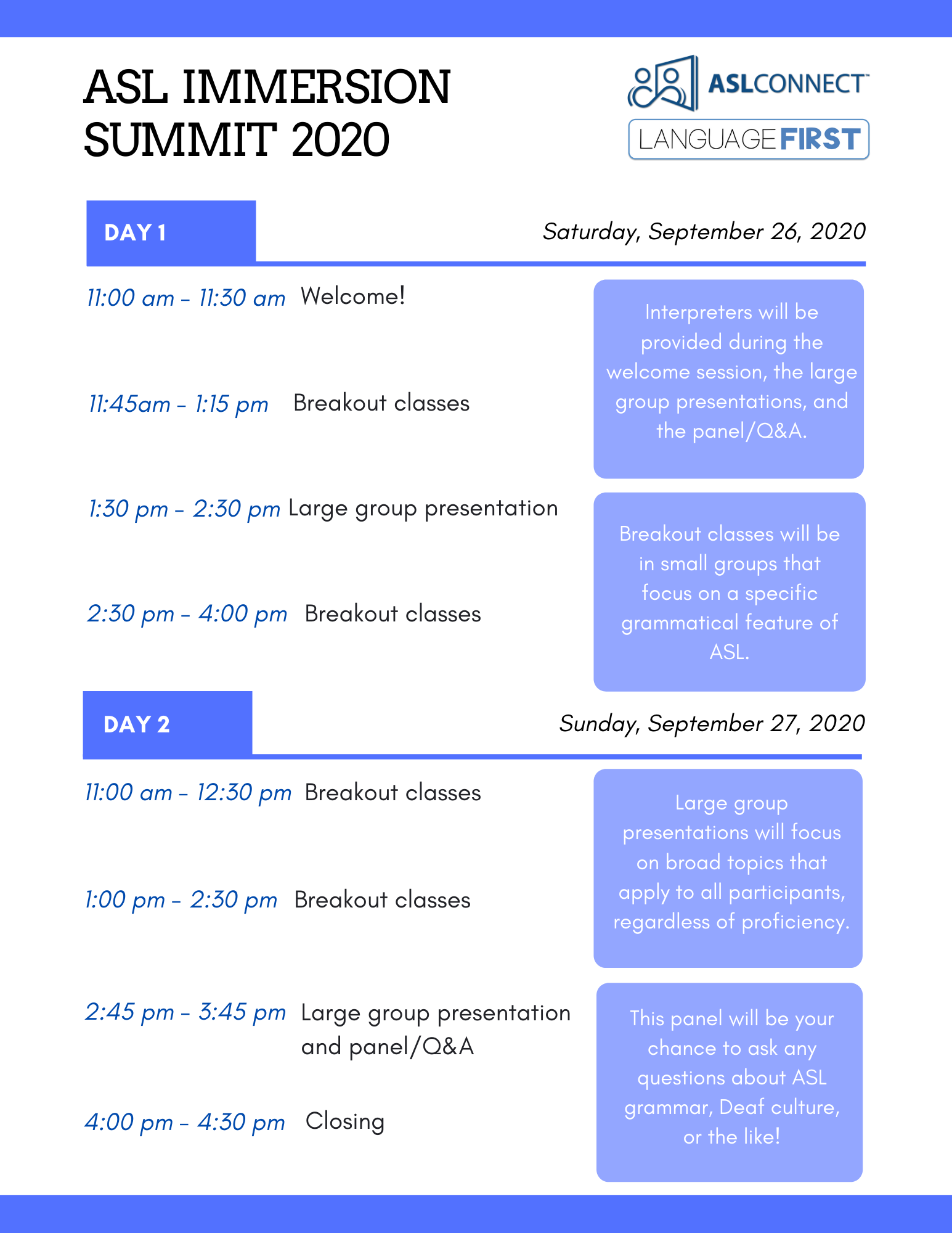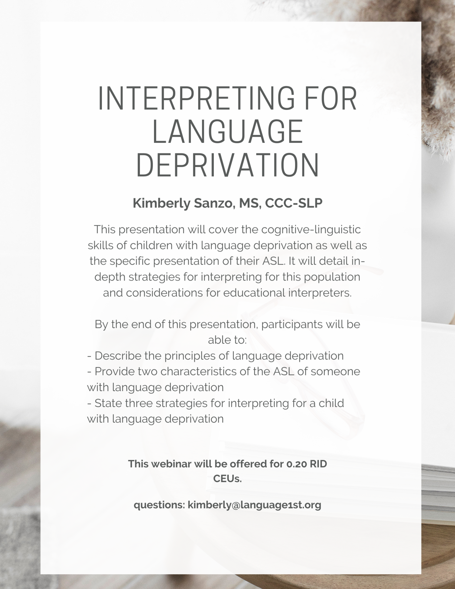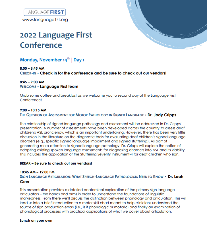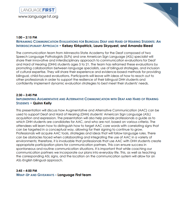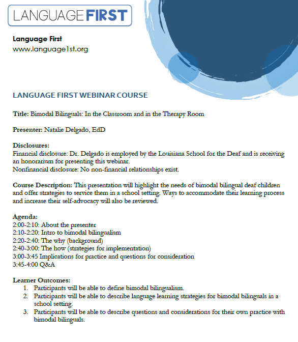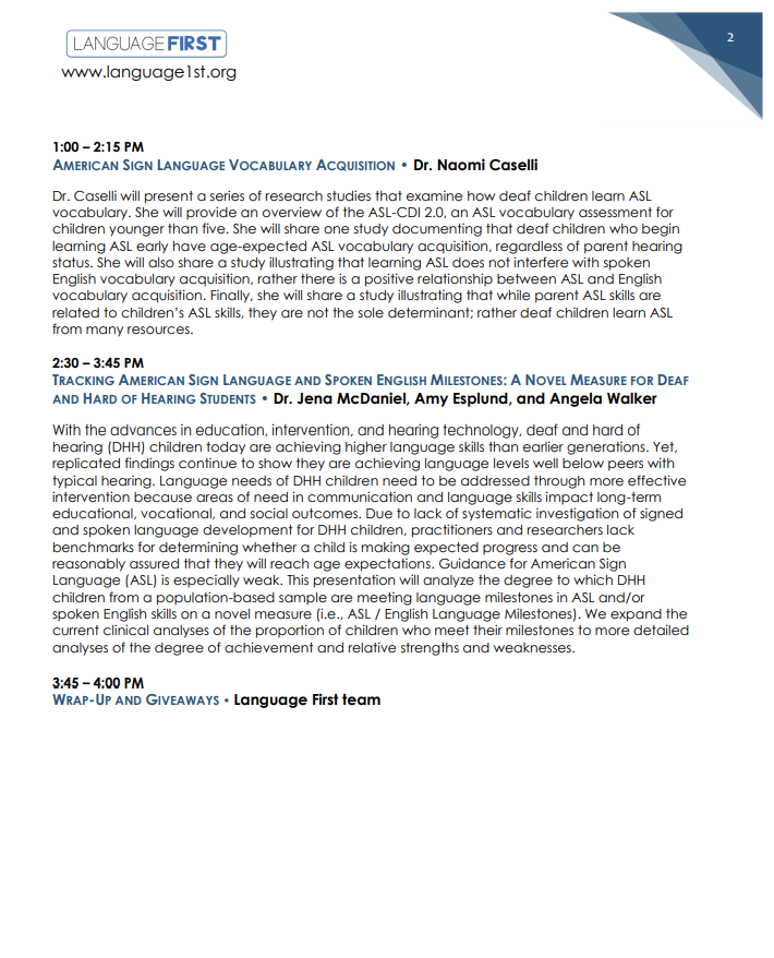 Interpreting for Suicide and Self-Harm Evaluations in the School Setting $39.00 Sold out Advocacy and Identity: Supporting Families in Navigating the Deaf and Hard of Hearing Experience $0.00 Sold out Let's Dive Deeper: Autism and Diagnostic Decision Making in DHH Children $39.00 Sold out Signed Language Intervention for Clinicians and Educators (SLICE) $600.00 Sold out Immigrant Deaf Students of Color: Raciolinguistic Discourses on the Axes of Accommodation, Acculturation, and Racialization $39.00 Sold out Intersectionality, Language Deprivation, and You $39.00 Sold out Educational Audiologists: Partners in Language Acquisition for Deaf and Hard of Hearing Children $0.00 Sold out Unlocking Perspective-Taking Skills Through Language and Literacy for DHH Children $0.00 Sold out 2025 Language First Conference from $200.00 Sold out From Mode to Meaning: The Shift from Communication Mode to Language Priority in Deaf Education $0.00 Sold out Deaf Students' and Interpreters' Positioning in Mainstream Classrooms: A Collaborative Approach $0.00 Sold out Writing Instruction with Deaf Students $0.00 Sold out Immigrant Families with Deaf and Hard of Hearing Children $0.00 Sold out The Spectrum of Language Deprivation Across Populations $0.00 Sold out I See What You Mean: Empowering Deaf Students with Effective Writing Instruction $0.00 Sold out Building Communication Bridges $0.00 Diversity, Equity, Inclusion, & Belonging in Lesson Plans for Early Childhood Education $0.00 Sold out Maximizing Language Acquisition with ASL Rhymes, Rhythm and Repetition $0.00 Sold out Assessing Language Access Profiles in Deaf & Hard of Hearing Children: Why & How? $0.00 Sold out Dual Sensibilities: Literacy Approaches for Deaf Learners with Autism $0.00 Sold out Integrating ASL Instruction in Bilingual Education: Developing Metalinguistic Knowledge and Cognitive Growth in Deaf Children $0.00 Sold out Freeing the Butterfly Conference: Language Access for DHH Children from $80.00 Sold out Social Construction of Deafness in Early Intervention $0.00 Sold out Decoding the Impact: EIPA Scores and their Influence on Deaf Children's Education $0.00 Sold out Identification, Diagnosis, and Provision of Support: ADHD in DHH Children $0.00 Sold out Unilateral Deafness $0.00 Sold out Supporting Vocabulary Development in Young Deaf and Hard of Hearing Children with Explicit/Contextualized Vocabulary Instruction $39.00 Sold out Bilingual Languaging Patterns: Case Studies of Deaf Students with Possible Language Disabilities $39.00 Sold out Benefits of VL2 Storybook Apps $0.00 Sold out Family-Centered Early Intervention Deaf/Hard of Hearing (FCEI-DHH): Summary of Principles & Recommendations for Professionals $0.00 Sold out Assessments and Evidence-Based Instructional Strategies for DHH Learners- Pah! $0.00 Sold out AAC Candidacy and Device Selection for DHH Students $0.00 Sold out 2024 Language First Conference $0.00 Sold out Bilingual Language Development in DHH Children Acquiring ASL and Spoken English $0.00 Sold out Nurturing High Expectations for Lifelong Success from a Parent's Perspective $0.00 Sold out Enhancing Self-Regulation in Deaf and Hard of Hearing Children $0.00 Sold out Impact of Language Deprivation & Educational Approaches $0.00 Sold out How the Science of Reading Applies to Deaf Students $0.00 Sold out Exploring DeafBlind Language and Culture $0.00 Sold out Busy Teacher Hacks to Help You Lighten the Load $0.00 Sold out Rethinking Aural Rehab: A New Framework for Teaching, Supervising, and Engaging in Clinical Work $0.00 Sold out Reading Instruction: "Where Do We Start?" $0.00 Sold out 2023 Language First Conference from $190.00 Sold out Examining A Family-Centered ASL Curriculum: Provider Perceptions and Parent Outcomes $0.00 Sold out The Development and Implementation of Language and Communication Profiling and Planning for Multimodal Multilingual Communicators $0.00 Sold out Deaf Gain and Human Rights: Visual Strategies for Spoken and Sign Languages $0.00 Sold out Making a Language-Rich Environment Everywhere You Go: Strategies to Use with Young Learners $0.00 Sold out Foundations in Research-Based Speech/Language Therapy (FiRST) Training $0.00 Sold out Movement Deletion and Hold Reduction in ASL $0.00 Sold out Reading HOW?: Let Me Count the Ways $0.00 Sold out From Candidate to User: Determining Deaf-Friendly AAC that Supports Client-Specific Communication $0.00 Sold out Language— and Policy— Begin at Birth: How They Impact Deaf Education $0.00 Sold out Your Bias, What? $0.00 Sold out Is Fingerspelling English? $0.00 Sold out The Fundamental Framework for Deaf/Hard of Hearing Children: A Model from the Child’s Perspective $0.00 Sold out Dismantling White Supremacy: A Multilayered Approach from the Classroom to the Administration $0.00 Sold out Language Deprivation in the Current Era $0.00 Sold out Representation Matters: Picture Books for Deaf and Hard of Hearing Children $0.00 Sold out The Tip of the Iceberg: Working with Deaf English Language Learners (ELLs) $39.00 Sold out The Linguistics of SLP Practice: Apply What You Know to Signed Languages $0.00 Sold out From Void to Voice: Culturally Responsive Arts Education for Deaf Students $0.00 Sold out Speech and Language Services for Middle School and High School DHH Students: Keepin' It FUNctional $0.00 Sold out Considerations for Reducing the Trauma Experienced by DHH Children and their Families $0.00 Sold out Trauma-Informed Interpreting with Children $0.00 Sold out Kenyan Sign Language: Supporting Deaf Kenyan Students $0.00 Sold out Dynamic Assessment Tools: Mediated Learning Experience for DHH Students $0.00 Sold out Annual Conference $0.00 Sold out Ethical Considerations for Working with Deaf Children $0.00 Sold out Using a Visual Intervention to Improve Syntax in Deaf Children Who Sign $0.00 Sold out Using the Spoken Language Checklist with Deaf and Hard of Hearing Children $0.00 Sold out Implicit and Explicit Language Learning $0.00 Sold out Using